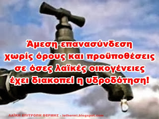 - Να θυμήσουμε ότι, παρά τα περί του αντιθέτου λεγόμενα απ' το Δήμο, τα Δημοτικά Τέλη Ύδρευσης, με τη νέα τετράμηνη κλίμακα, καταστούν ακόμη και το νερό, το κοινωνικό αυτό αγαθό, είδος πολυτελείας! Η προς τα πάνω εξίσωση των τελών έχει κυριολεκτικά αφαιμάξει τους κατοίκους και ήρθαν σαν καταπέλτης στα σε όλες τις δημοτικές ενότητες της Θέρμης.